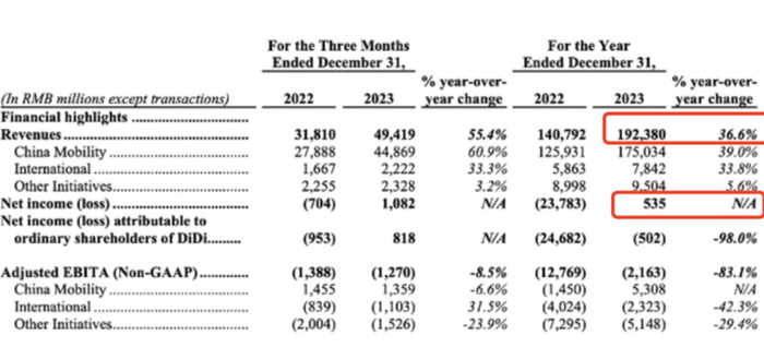 平台方面,据滴滴财报显示,2023年全年度总收入为人民币1923.8亿元,同比增长36.6%,净利润5.35亿元,实现年度净利润转正。