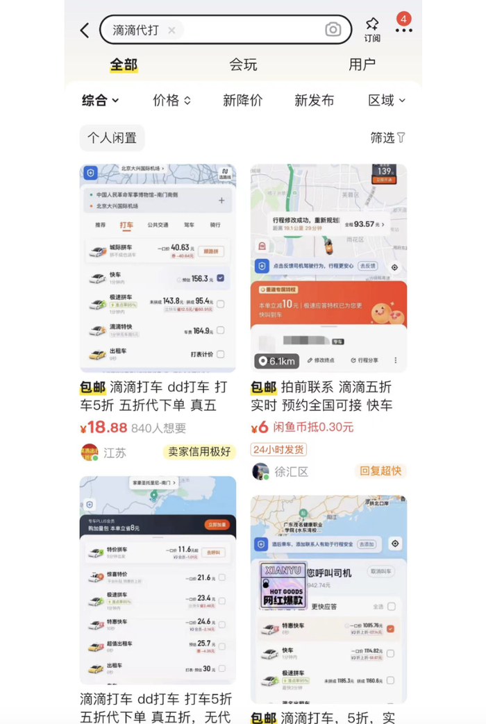 对此,蓝鲸记者在闲鱼上查询发现,以滴滴代打为关键词搜索出大量低价打车的帖子,这些卖家通常会打出“5折用车、出门必备、省钱神器”的宣传语。乘客只需提供起点位置和终点位置的截图,卖家便能够帮用户叫车,等到上车后乘客把半价的车费发给卖家,这单交易就算完成了。