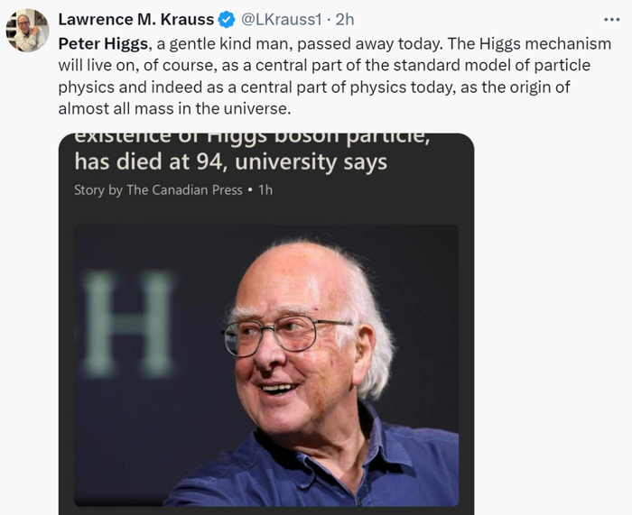 根据爱丁堡大学的一份声明我们得知(彼得・希格斯是该校的荣誉退休教授),希格斯经历短暂的生病后,于 4 月 8 日星期一在家中安静的离开。