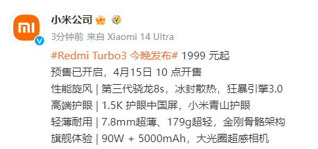 4月10日,据小米公司微博消息,Redmi Turbo3今晚发布,售价1999元起。