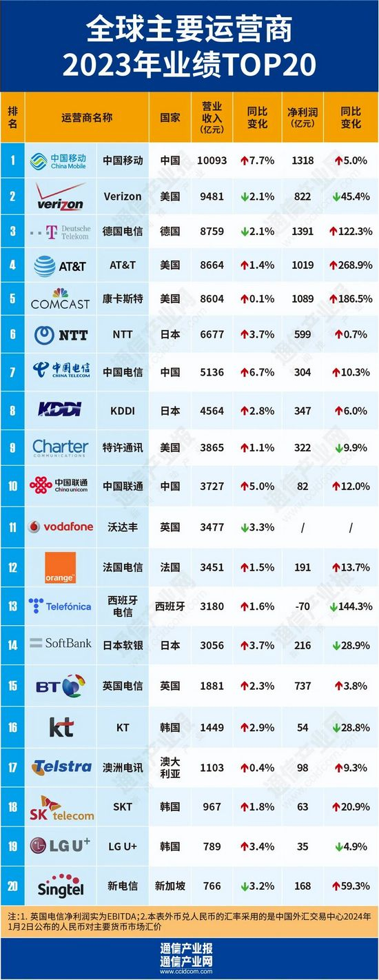 据统计,截至目前全球共有1250家移动通信运营商、80家电信运营商集团和4600张商业网络,《通信产业报》全媒体从这些运营商集团中选择了20家运营商集团公司作为比较对象,从营收和净利润两个层面一窥全球电信市场2023年的发展。这些运营商集团分别是亚太地区的中国电信、中国联通、中国移动、NTT、日本软银、KDDI、SKT、KT、LG U+、新电信和澳洲电讯,北美洲的AT&T、Verizon、康卡斯特、特许通讯,欧洲的德国电信、法国电信、西班牙电信、沃达丰、英国电信。