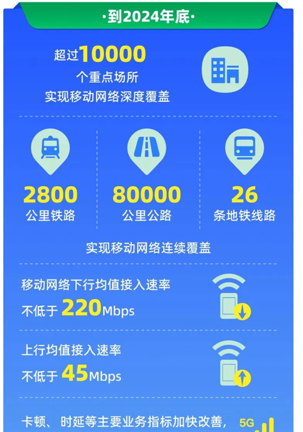 到2024年底,移动网络下行均值接入速率不低于220Mbps,上行均值接入速率不低于45Mbps,业务指标包括卡顿、时延等将加快改善,移动网络达标速率占比不低于90%。