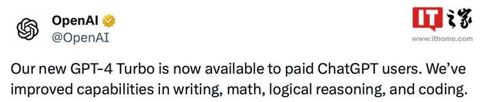 IT之家 4 月 12 日消息,OpenAI 今日宣布,新 GPT-4 Turbo 现已向付费 ChatGPT 用户开放。与 1 月份相比,新版本提高了写作、数学、逻辑推理和编码的能力。GPT-4 Turbo 可在 ChatGPT Plus、Team、Enterprise 和 API 中使用。