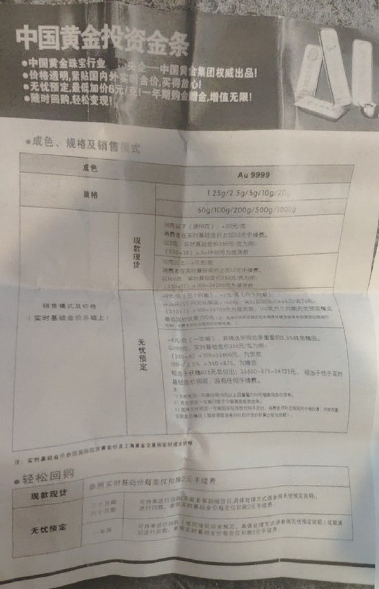 事实上,中国黄金双井富力广场店出问题的是名为“金条无忧预订”的托管业务,就是在一次性交清货款后不拿走金条,而是由金店托管,购买时每克能减免一定费用,还能按比例返还一些黄金产品作为“寄存利息”。