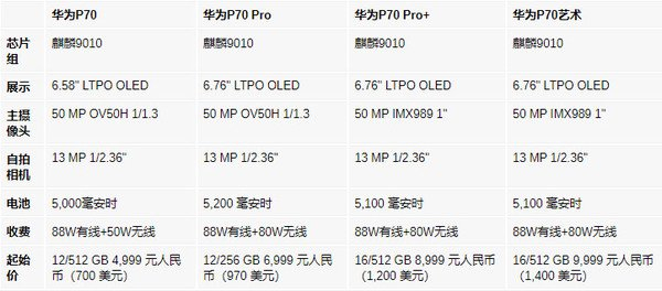 售价上,网传图片显示,华为P70最低采用12GB+512GB内存版本,售价4999元起,比前代更加便宜。P70 Pro售价6999元起,P70 Pro+售价8999元起,P70 Art售价9999元起。作为参考,目前华为商城显示,华为P60 512GB版售价为5988元。不过该机还提供了128GB和256GB版本,起售价低至4488元。