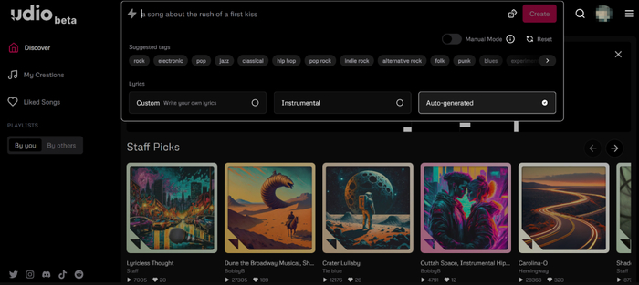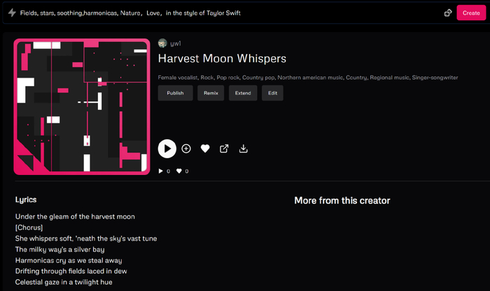 就像所有的AI生成工具一样,搜索框里用以键入要创作的歌曲的描述,包括自由描述和一些特定标签。
