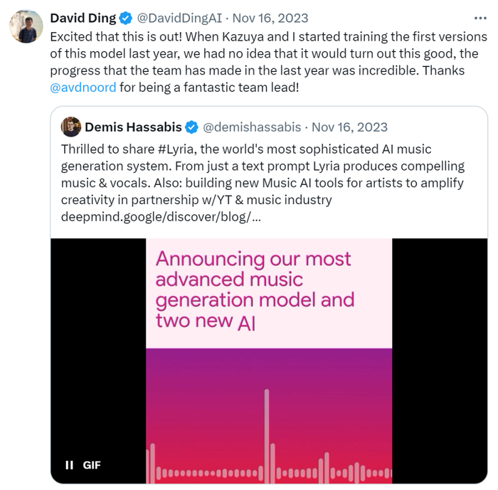 Lyria在2023年11月16日正式发布,而在当月,Ding Fengning已从谷歌离职,并创建了他的Udio。