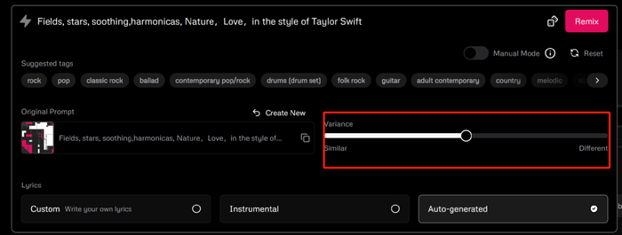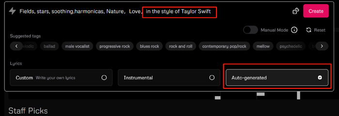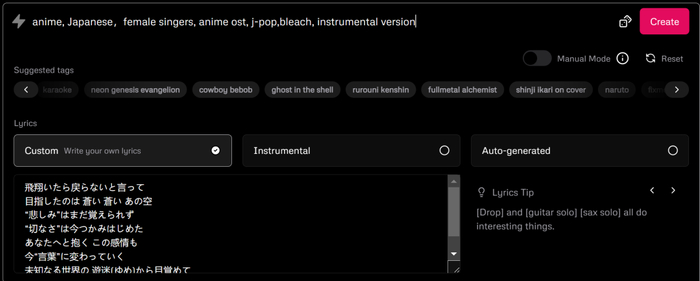 底部则是歌词,可以选择左侧的“Custom”贴入指定歌词,也可以选择中间的“Instrumental”纯音乐版,或是右侧的“Auto-generated”让歌词也自动生成。
