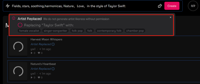 在指定特定的艺术家风格时,如果没有取得这位艺术家的授权,平台会自动将这位艺术家替换为相似的标签。