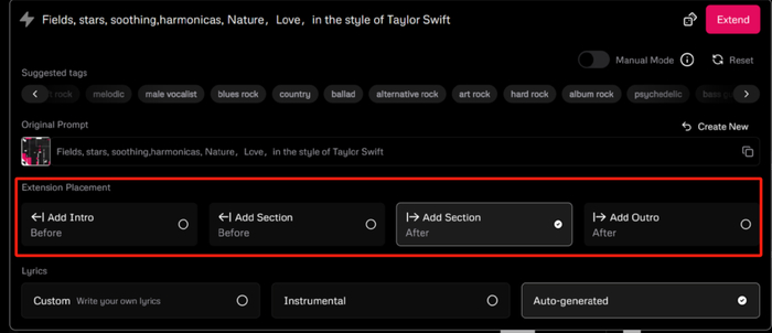 生成一首音乐后,就来到了Udio的两个核心功能——“混音”和“拓展”。