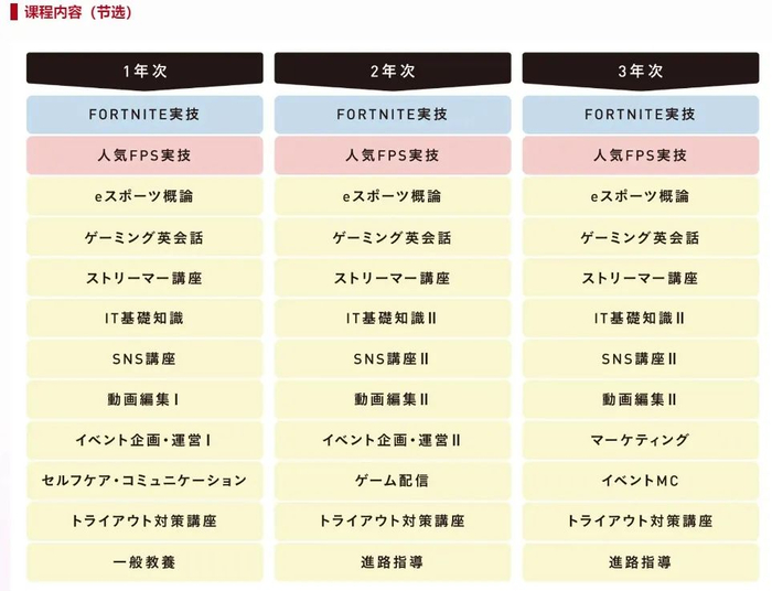 不知是为了方便学员与业内人士的交流,还是仅仅为了节约经费,这所学校就开设在科乐美的总部大楼里。据官网介绍,目前这所电竞学校的课程里只包含《堡垒之夜》和《无畏契约》这两个重点项目:因为这两款游戏都在日本开设了高中级别的赛事。