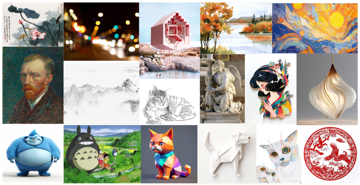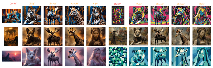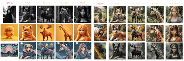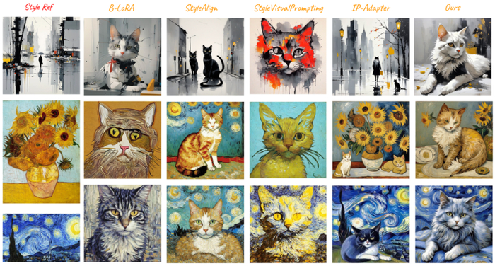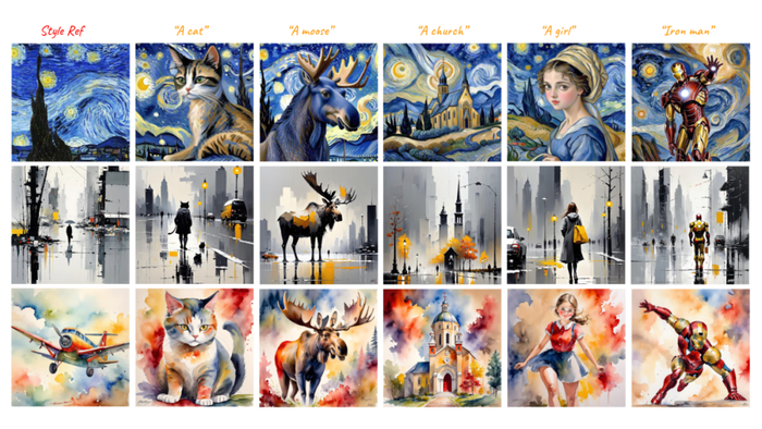 风格化图像生成,也常称为风格迁移,其目标是生成与参考图像风格一致的图像。此前基于 diffusion 的方法(比如 LoRA)通常需要批量的同风格数据进行训练,无法迁移到新的风格中,或者基于 inversion(如 StyleAlign),通过将风格图像还原到 latent noise 后,将其前向传播得到的 K、V 用于替换风格图像生成中的 K、V,但这类方法往往由于 inversion 的操作,造成风格退化。