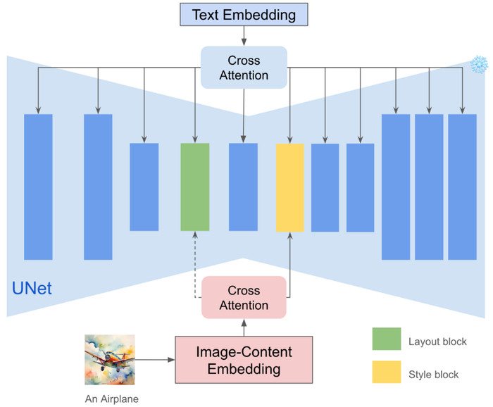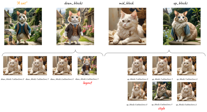 (2)仅风格层注入:仅在特定风格层完成特征注入,隐式地实现风格和内容的解耦。作者在 UNet 的 mid block 附近,发现了分别控制风格和空间布局的两个特定层,并发现在某些风格中,空间布局可能也属于风格的一种。