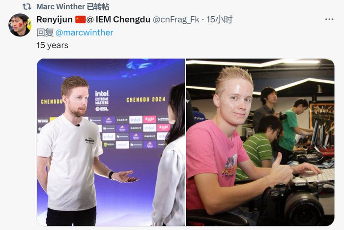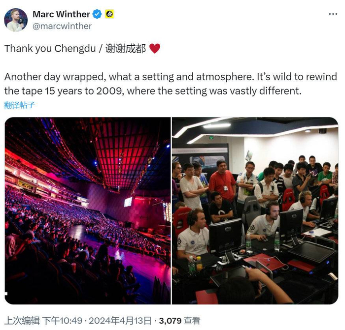 Marc Winther发布推文,用中文表示“谢谢成都”,并提到现场观赛氛围太棒了,和15年前的比赛相比,已经发生了非常大的变化。