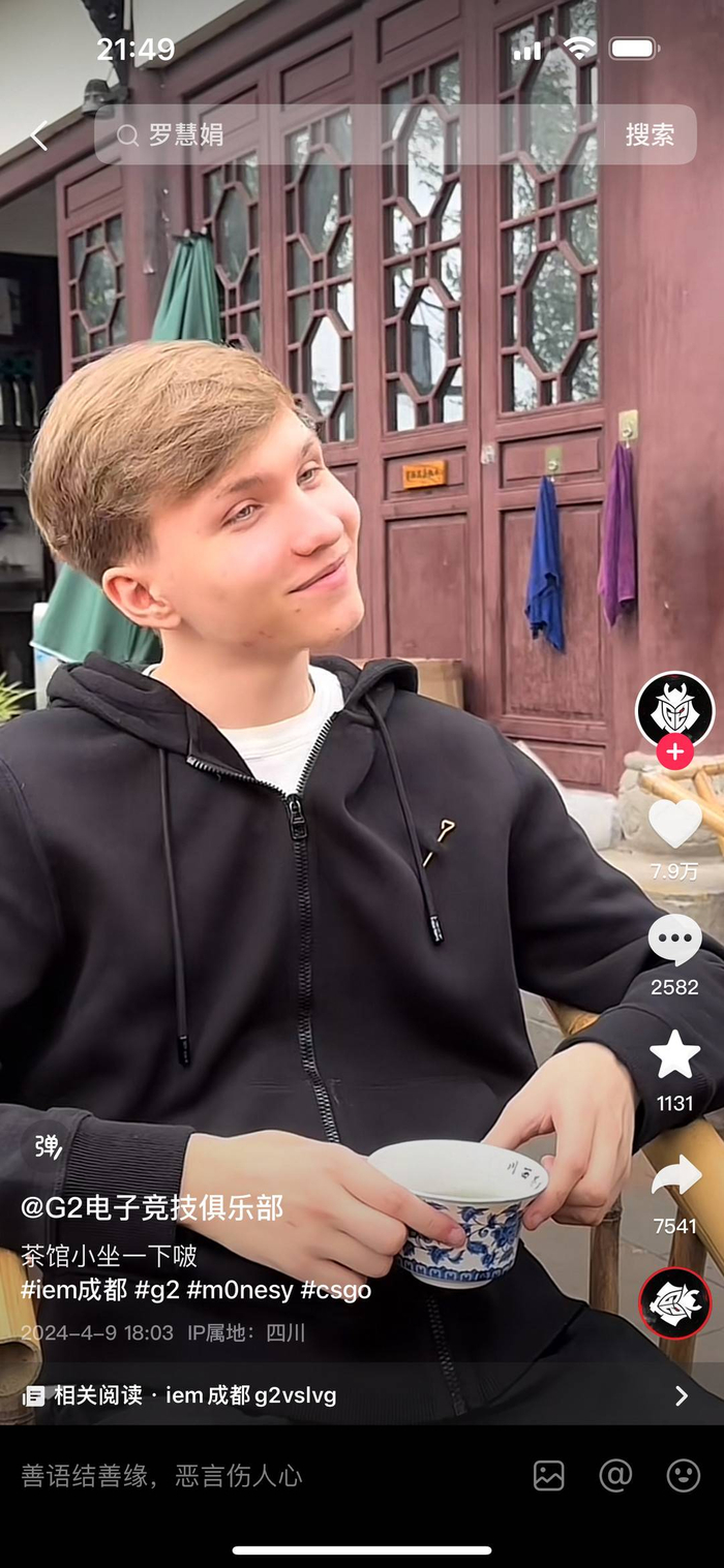 除了rain之外,获得3-4名的G2战队的选手们在休息日选择了在成都游玩,他们在IFS吃了火锅,还集体到成都大熊猫繁殖基地观看熊猫,甚至还坐在了成都的茶馆里喝茶,并在社交媒体上分享了这些动态,获得了很多粉丝互动。