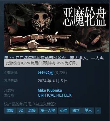 多亏了电子游戏,现在我们可以安全地在自己家的电脑前获得这种体验——目前Steam上的《恶魔轮盘》已经积攒了8700多条评测,好评率高达95%,而现在离这款游戏正式上线还不到一周时间: