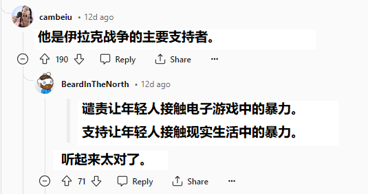 利伯曼被发现是2003年伊拉克战争的坚定支持者,也支持打击伊朗,作为犹太裔在巴以冲突中支持以色列——支持现实中的战争,却打击游戏里的暴力,他的“双标”立场引来玩家群体的大肆嘲讽。