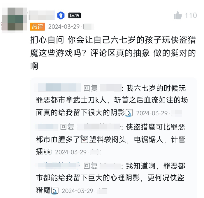 而国内不少玩家显然随着年龄的增长转变为了“家长”视角:他们有时会用自己平安无事的人生,来论证游戏远非许多上一代人所描述的“妖魔鬼怪”;同时却又担心起自己的孩子,生怕他们在自己一不留神时,就唐突接触到了《真人快打》《喋血街头》等游戏中的限制级内容。