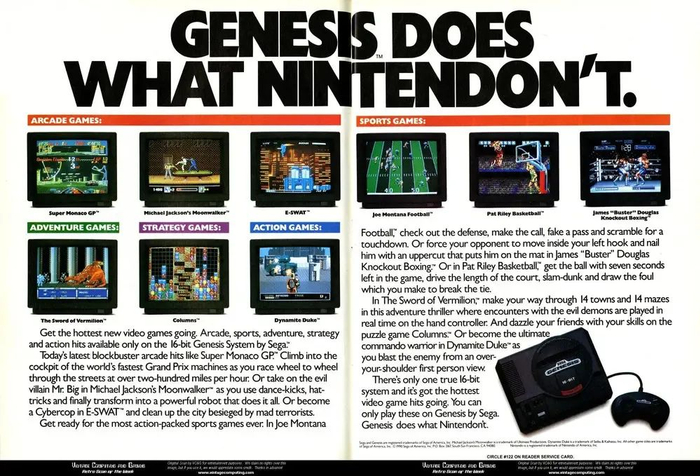 这成为了世嘉在市场营销过程中对抗任天堂的一个切入点。世嘉宣布放开审查,允许更多第三方游戏登陆其Genesis主机,积极扩充游戏库,还放出广告词:“世嘉做了任天堂不做的事”(Sega does what Nintendon't)。