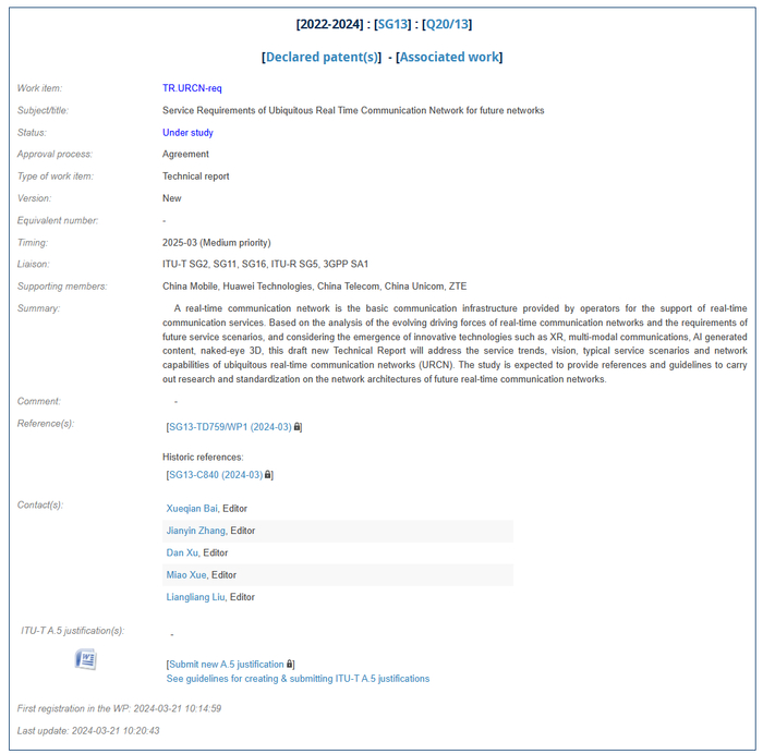 在日前举办的ITU-T标准会议上,中国移动在SG13 Q20工作组(Future networks and emerging network technologies) 成功牵头面向下一代网络的《泛在实时通信网络业务需求》(TR.URCN-req, Service Requirements of Ubiquitous Real Time Communication Network for future networks)研究项目立项,中国移动研究院专家担任该项目报告人。该立项是ITU-T首个面向未来网络的泛在实时通信课题,填补了ITU-T在该领域的空白,也是下一代泛在实时通信标准体系的重要一环。