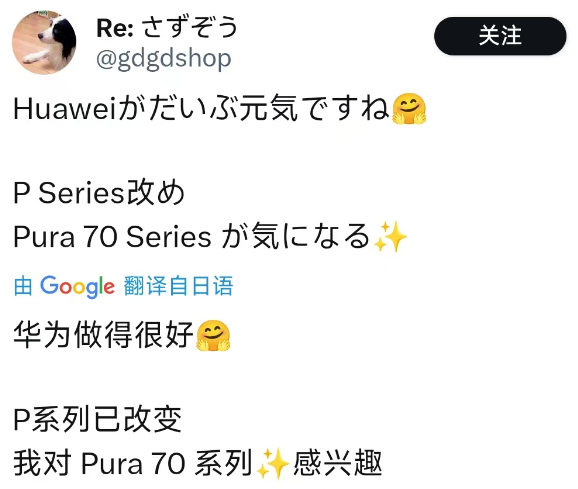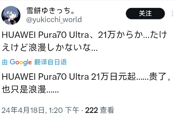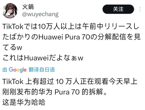 CNMO注意到,在X平台(原推特)上,不少日本网友都对华为Pura 70系列的外观设计和相机配置赞不绝口。有网友认为,除了GMS以外,华为几乎已经卷土重来了。与此同时,还有网友反馈称,现在在TikTok(海外版抖音)上有超过10万人正在观看华为Pura 70的拆解直播。当然,华为Pura 70收获的也并非全是好评,其售价也引起了一定的吐槽。有日本网友认为折合21万日元的价格实在太贵,转而考虑入手华为老款P系列旗舰。以下是部分讨论截图: