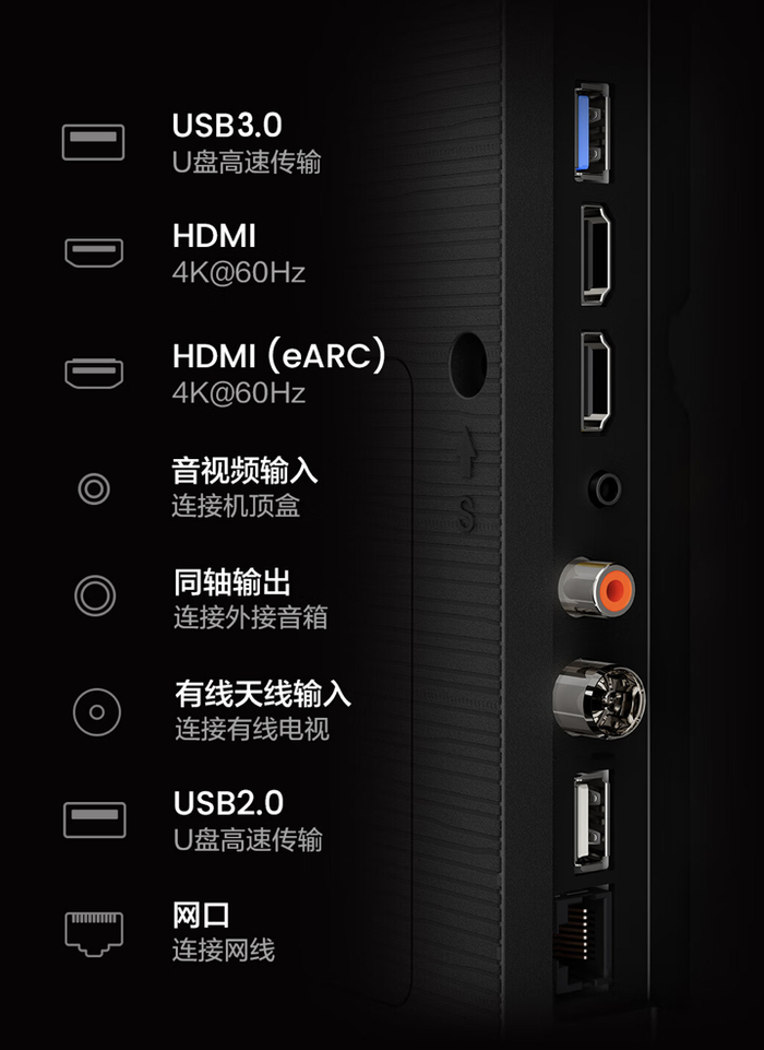 此外,这款电视配备 2 个 18W 扬声器,内置 4GB RAM 及 64GB 存储空间,拥有 1 个 USB-A 3.0 接口、2 个 HDMI 2.0 接口、1 个 3.5mm 音频接口、1 个 USB-A 2.0 接口、1 个 RJ45 接口。