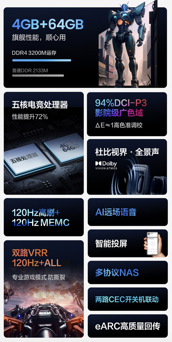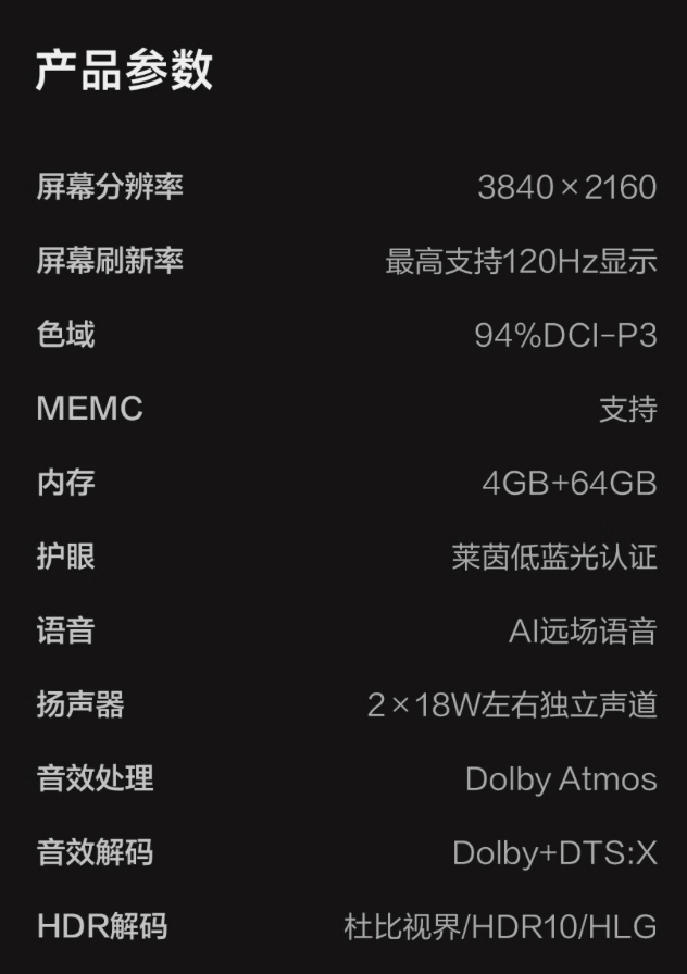 IT之家注意到,这款电视配备 4K 六重 120Hz 高刷面板,支持 MEMC 补偿、VRR 和 ALLM 低延迟,覆盖 10Bit 色彩,94% DCI-P3 色域,拥有莱茵低蓝光认证。