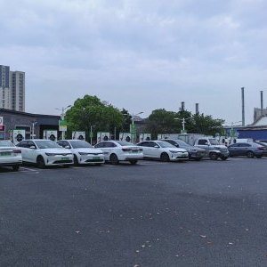 到达目的地后,记者找到一家网约车租赁公司。放眼望去,贴着“滴滴出行”的七八十辆新能源车整齐排列在充电桩前,其中间隔着几个空车位,左侧的两层小楼是司机休息室和宿舍。