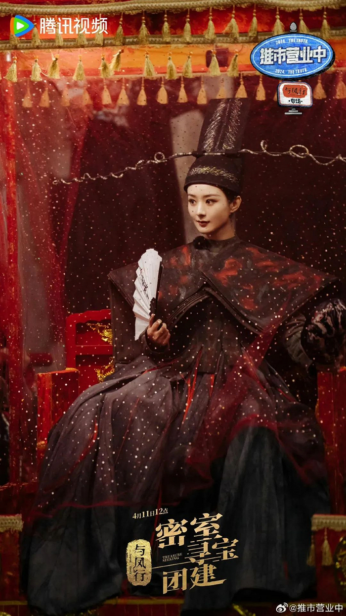 另一方面,哪怕是仅从综艺维度来看,《与凤行》团综也呈现出了不错的品相。首先,我们在2023年综艺复盘中就曾提出,综艺题材频繁洗牌、但密室推理却持续高光,仅仅是“中式恐怖”就足以吸引一批类型题材粉丝入局;预热阶段就释出的赵丽颖判官造型,片头的非遗项目、民俗文化,也都极具吸引力。