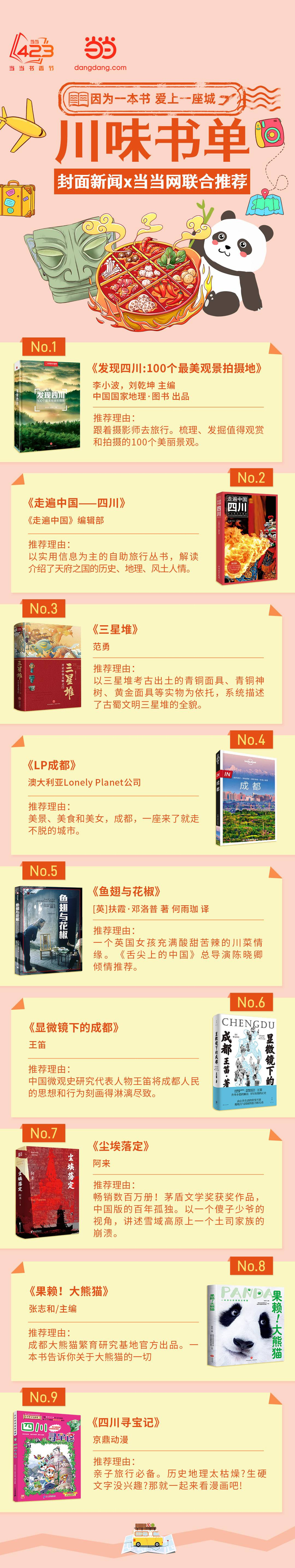 第30个世界读书日来临之际,当当网“因为一本书,爱上一座城”系列书单走进四川。4月21日,封面新闻联合当当网,基于图书平台的阅读消费大数据,为大家推荐让读者“种草”四川的9本书籍,发布“川味书单”。过去一年里,大家爱看什么关于四川的书籍,通过哪些书可以快速的了解四川,答案都在书单中。(文末有福利)