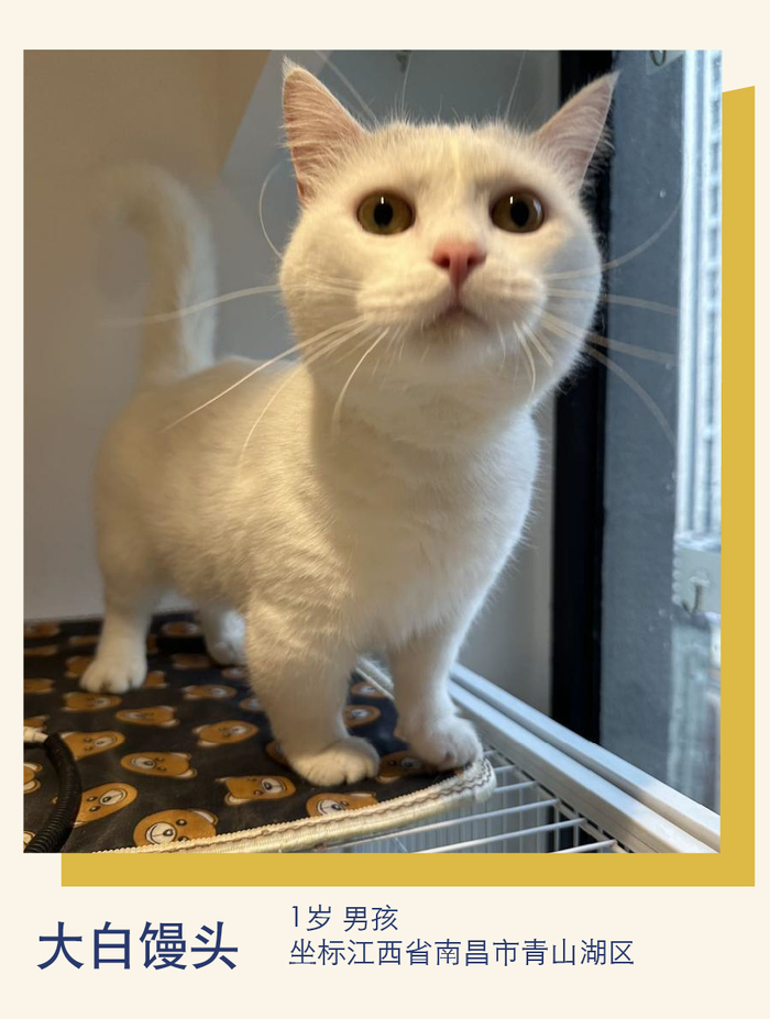 救助经历:大白馒头是一只流浪的矮脚银点,捡到的时候脖子上有红色绳编项圈,身上还香香的。脾气好又亲人,已做绝育。真心希望能帮助馒头找到好的归宿,重新拥有温暖的家。