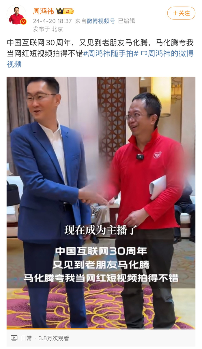 鞭牛士报道,4月20日消息,360董事长周鸿祎在社交网络发布参加中国互联网30周年活动现场照片,称腾讯CEO马化腾夸他网红做得好。