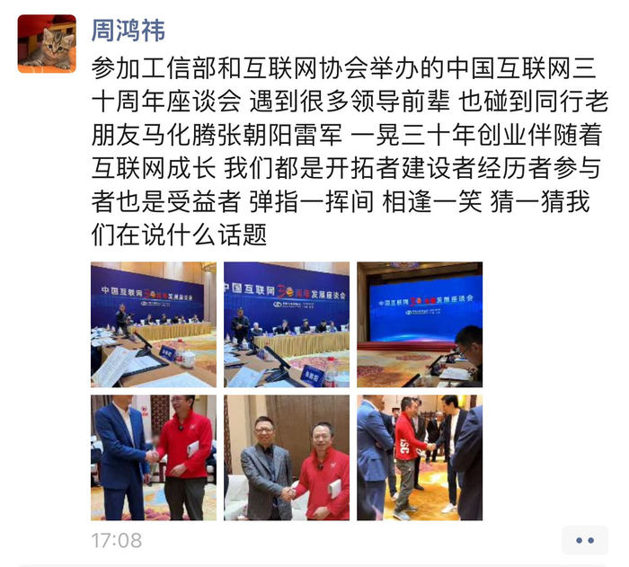 参加工信部和互联网协会举办的中国互联网三十周年座谈会 遇到很多领导前辈 也碰到同行老朋友马化腾张朝阳雷军 一晃三十年创业伴随着互联网成长 我们都是开拓者建设者经历者参与者也是受益者 弹指一挥间 相逢一笑 猜一猜我们在说什么话题