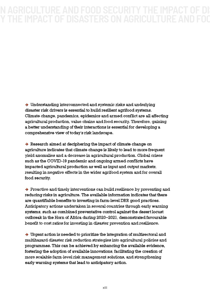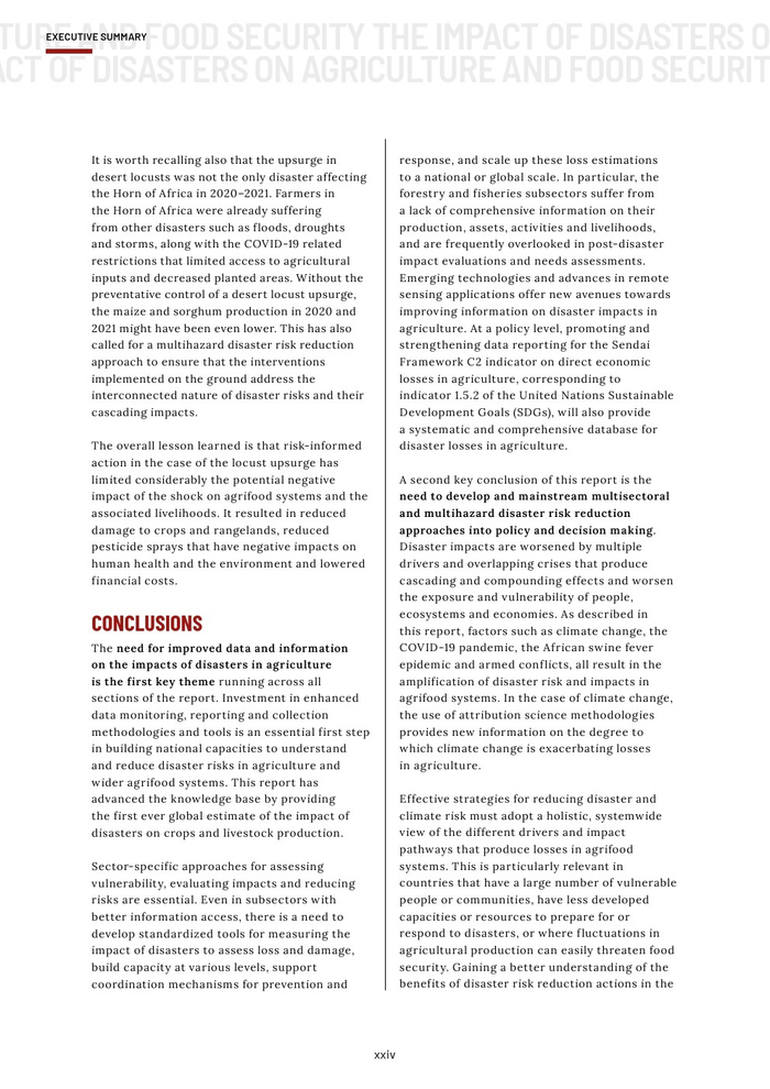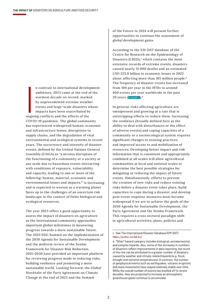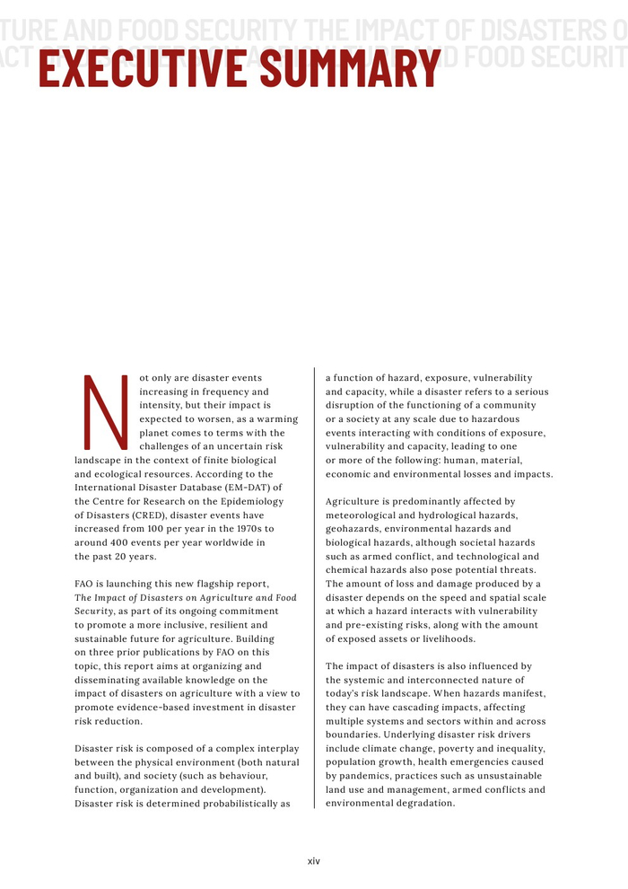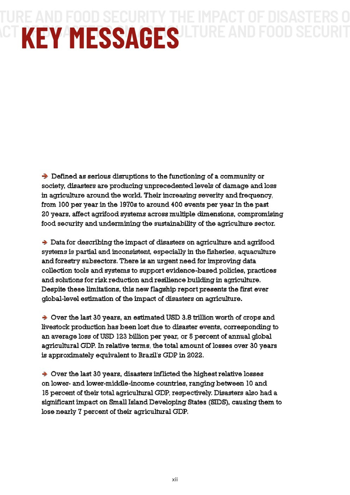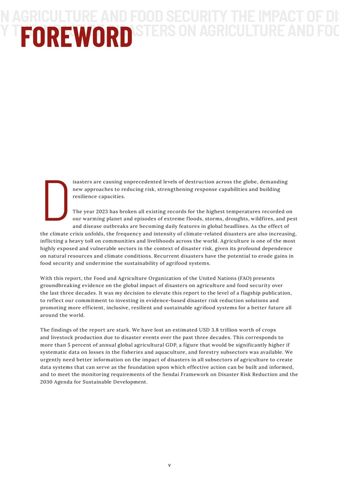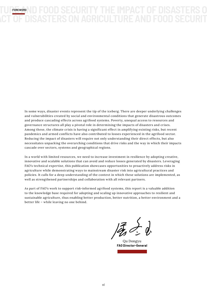 粮农组织的报告作为其促进更具包容性、抗灾能力和可持续性的农业未来的持续承诺的一部分。本报告旨在组织和传播有关灾害对农业影响的现有知识,以促进在减少灾害风险方面的循证投资。