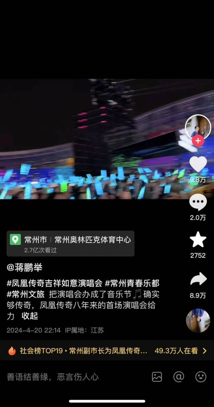 4月20日晚,凤凰传奇“吉祥如意”2024巡回演唱会首站在常州奥体中心体育场开唱。有不少网友在抖音、微博等社交媒体平台刷到一则演唱会现场视频,发布人名为蒋鹏举。网友从日常发布内容和留言发现,发布人就是常州市副市长蒋鹏举。这一消息,迅速引发了舆论关注。
