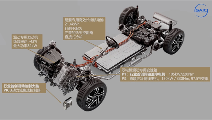 上汽的DMH超级混动,在技术路线上用实力致敬比亚迪DM-i,都是采用P1+P3的双电机结构与串并联模式,单档直驱,发动机热效率达43%,与比亚迪DM-i一致。