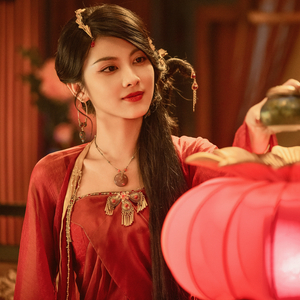 直到《与凤行》第29集,“金娘子”才出场:侧对着沈璃(赵丽颖 饰)和行止(林更新 饰)而坐,一袭红衣,露出一双修长美腿的她缓缓转过身来,轻摇团扇,撅着嘴,俏皮地瞪着眼睛,妩媚中透着灵动。