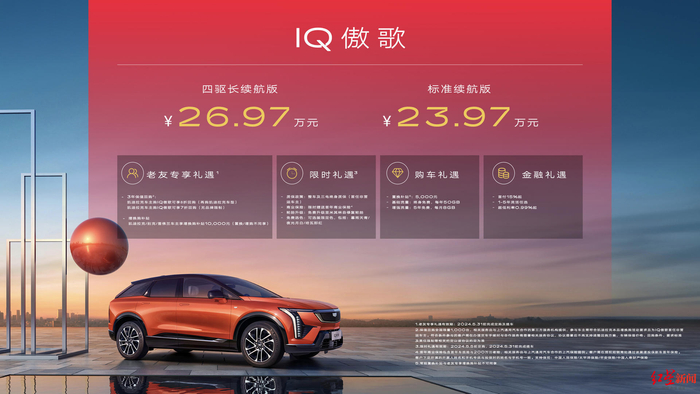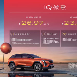 凯迪拉克IQ傲歌正式上市,新车提供2种续航里程选择,标准续航版售价23.97万元,四驱长续航版26.67万元。作为凯迪拉克第二款纯电车型,天际线一体式仪表台呼应游艇式环抱座舱、33英寸环幕式超视网膜曲面屏、270°环抱式设计伊姆斯灵感人体工学座椅和超大全景玻璃穹顶标配电动遮阳帘以及系标配的AKG录音室级高保真音响系统营造出沉浸式豪华享受。