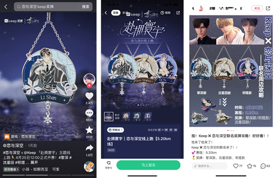 正是基于对这款游戏的深入调研和用户洞察,此次Keep与《恋与深空》联名的运动奖牌整体围绕恋爱主题、结合跑步特点,命名为“赴拥寰宇”,释义为“星河璀璨、奔赴浪漫,迈向你的每一步都值得记录”。赛程分为1.18km和5.20km,分别寓意“跨越光年”和“与你并肩”。用户只需在4月25日-6月17日期间,在Keep官方页面报名并完赛便可获得黎深、沈星回、祁煜任意一款实体奖牌。