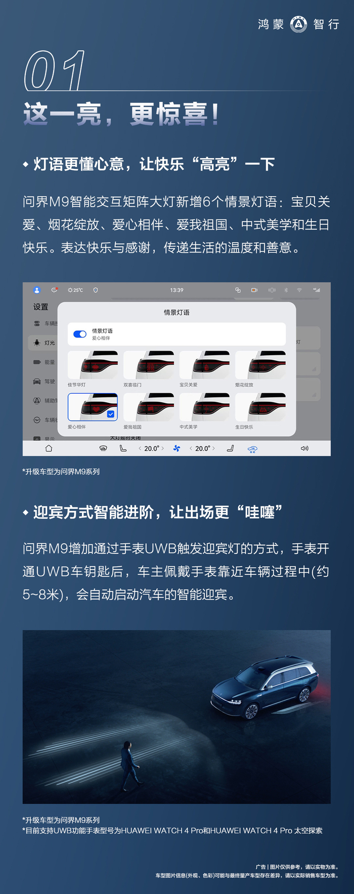 本次 OTA 问界 M9 的智能交互矩阵大灯新增 6 个情景灯语:宝贝关爱、烟花绽放、爱心相伴、爱我祖国、中式美学和生日快乐。迎宾方式也迎来智能进阶,问界 M9 增加通过手表 UWB 触发迎宾灯的方式,手表开通 UWB 车钥匙后,车主佩戴手表靠近车辆过程中(约 5-8 米),会自动启动汽车的智能迎宾。