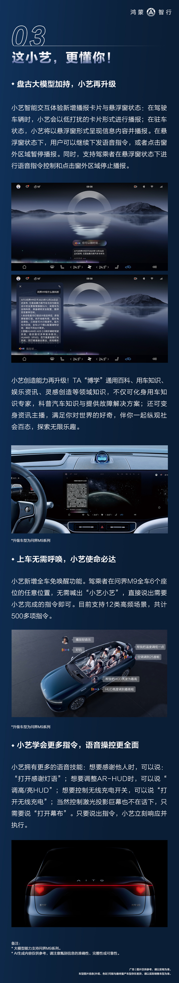 本次 OTA 问界 M9 的小艺语音助手迎来升级,新增播报卡片与悬浮窗状态:在驾驶车辆时,小艺会以低打扰的卡片形式进行播报。在驻车状态,小艺将以悬浮窗形式呈现信息内容并播报。在悬浮窗状态下,用户可以继续下发语音指令,或者点击窗外区域暂停播报。同时,支持驾乘者在悬浮窗状态下进行语音指令控制和点击窗外区域停止播报。