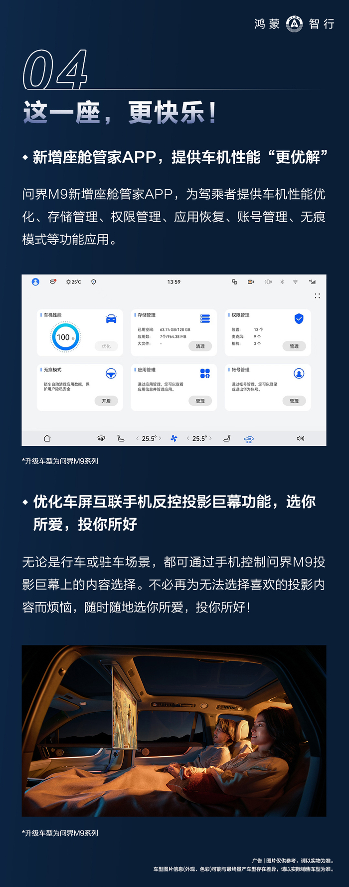 本次 OTA 问界 M9 新增座舱管家 App,为驾乘者提供车机性能优化、存储管理、权限管理、应用恢复、账号管理、无痕模式等功能应用。此外还优化了车屏互联手机反控投影巨幕功能,无论是行车或驻车场景,都可通过手机控制问界 M9 投影巨幕上的内容选择。