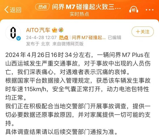4月26日,山西运城一辆问界M7车辆发生交通事故,引发关注。