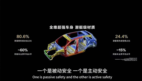 问界新M7在发布时,官方宣称,被动安全方面,问界新M7车身结构匹配开模,重新改造焊装产线,更安全、更可靠。全车潜艇级热成型钢占比24.4%,全面优于现售50万级豪华品牌主流车型。