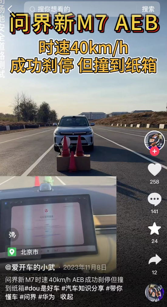 还有一位汽车博主称测试视频显示,问界新M7 AEB测试,时速40km/h,成功刹停,但撞到了前方纸箱。