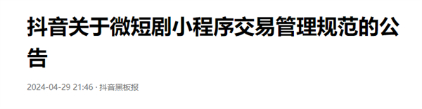 日前,“抖音黑板报”发布“关于微短剧小程序交易管理规范的公告”。