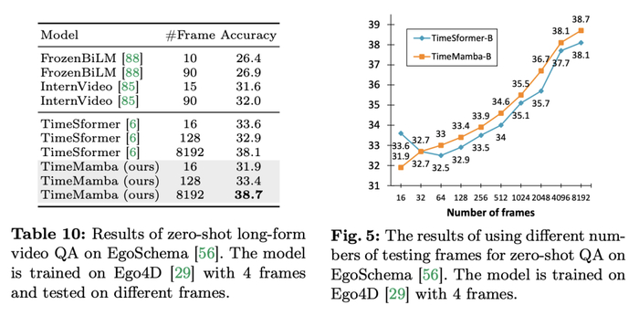 无论是 TimeSformer 还是 TimeMamba,在 Ego4D 上预训练后,都超过了大规模预训练模型(例如 InternVideo)的性能。此外,研究团队从视频开始以固定的 FPS 不断增加了测试帧的数量,以探索 ViM 块长视频时间建模能力的影响。尽管两个模型都是用 4 帧预训练的,但随着帧数的增加,TimeMamba 和 TimeSformer 的性能稳步提高。同时,当使用 8192 帧时,可以观察到显著的改进。当输入帧超过 32 时,TimeMamba 通常比 TimeSformer 从更多的帧数中受益,表明时间 ViM 块在时序自注意力方面具有优越性。