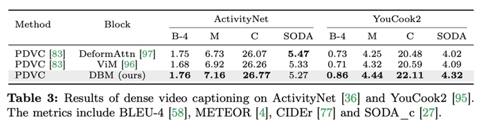 任务和数据:研究团队对 Mamba 在五个视频时间任务上的性能进行了评估:时间动作定位(HACS Segment),时间动作分割(GTEA),密集视频字幕(ActivityNet,YouCook),视频段落字幕(ActivityNet,YouCook)和动作预测(Epic-Kitchen-100)。