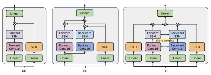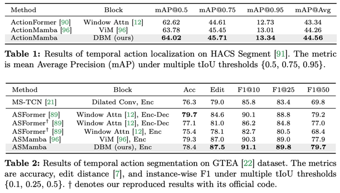 基准线和挑战者:研究团队选择了基于 Transformer 的模型作为各项任务的基线。具体来说,这些基线模型包括 ActionFormer,ASFormer,Testra 和 PDVC。为了构建 Mamba 的挑战者,他们将基线模型中的 Transformer 模块替换为基于 Mamba 的模块,包括如上图三种模块,原始的 Mamba (a),ViM (b),以及研究团队原创设计的 DBM (c) 模块。值得注意的是,在涉及因果推断的动作预测任务中,论文中将基线模型与原始的 Mamba 模块进行了性能比较。