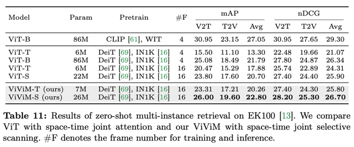 结果展示了不同时空模型在零样本多实例检索上的性能。当比较 ViT 和 ViViM 时,两者都是在 ImageNet-1K 上预训练的,可以观察到 ViViM 的性能超过了 ViT。有趣的是,尽管在 ImageNet-1K 上 ViT-S 和 ViM-S 之间的性能差距很小(79.8 vs 80.5),但 ViViM-S 在零样本多实例检索上显示出显著的改进(+2.1 mAP@Avg),这表明 ViViM 在建模长序列方面非常有效,从而提高了性能。